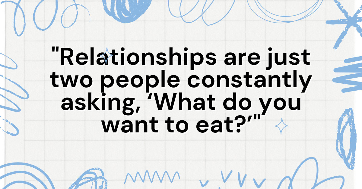 - “Relationships are just two people constantly asking, ‘What do you want to eat?’”