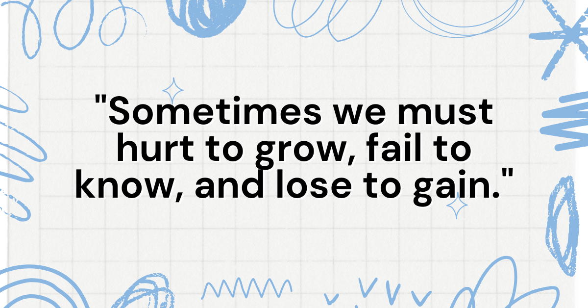 - “Sometimes we must hurt to grow, fail to know, and lose to gain.”
