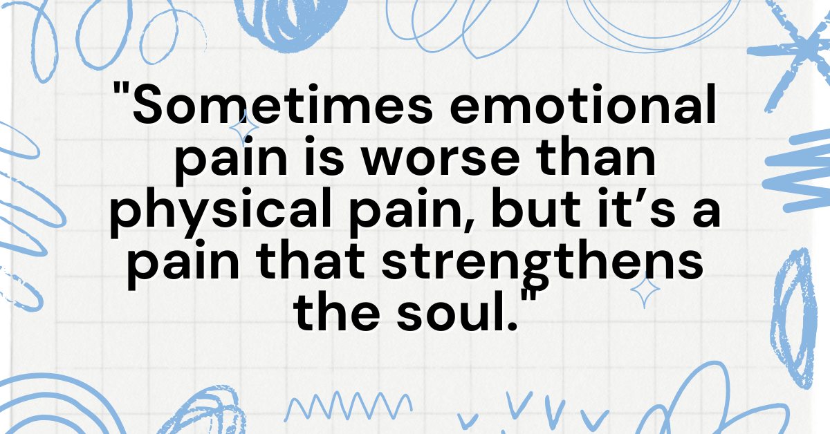 - “Sometimes emotional pain is worse than physical pain, but it’s a pain that strengthens the soul.”