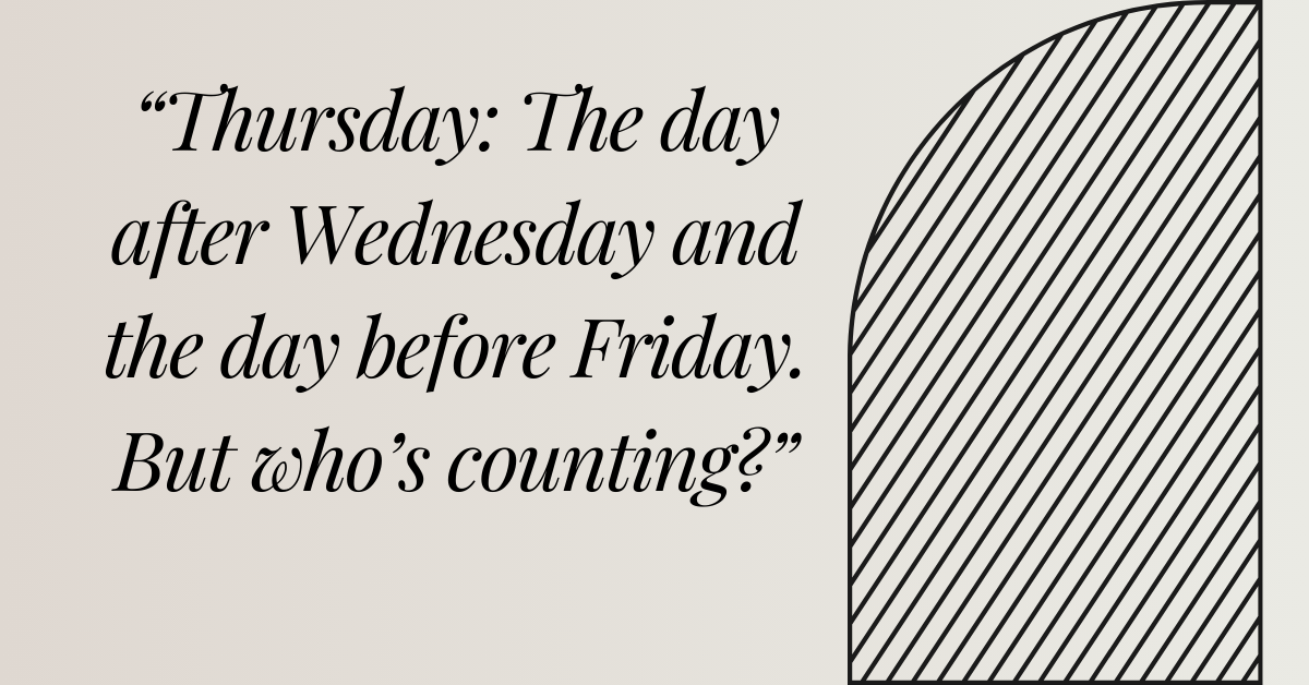 - “Thursday: The day after Wednesday and the day before Friday. But who’s counting?”